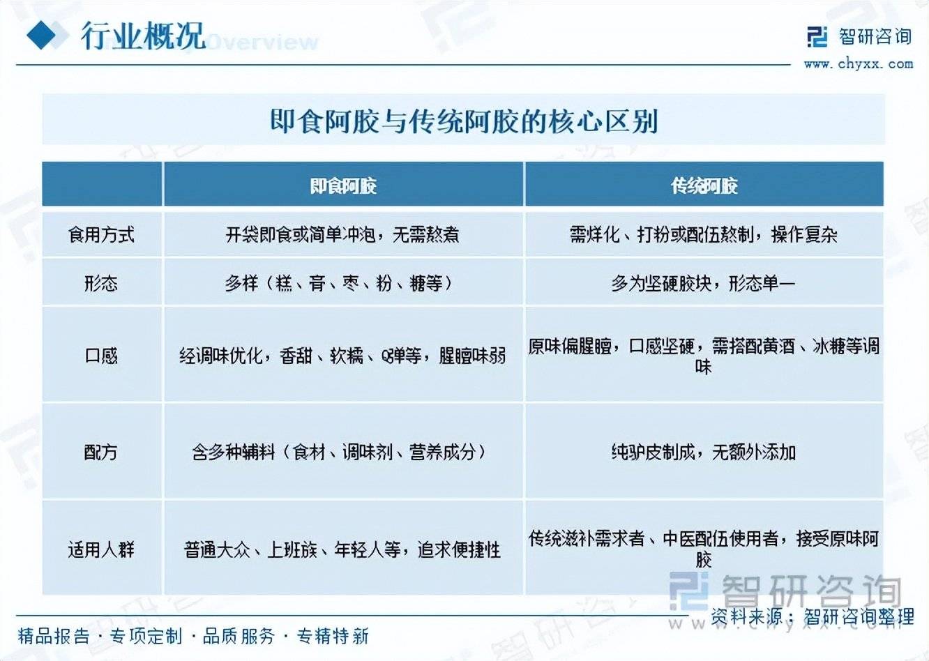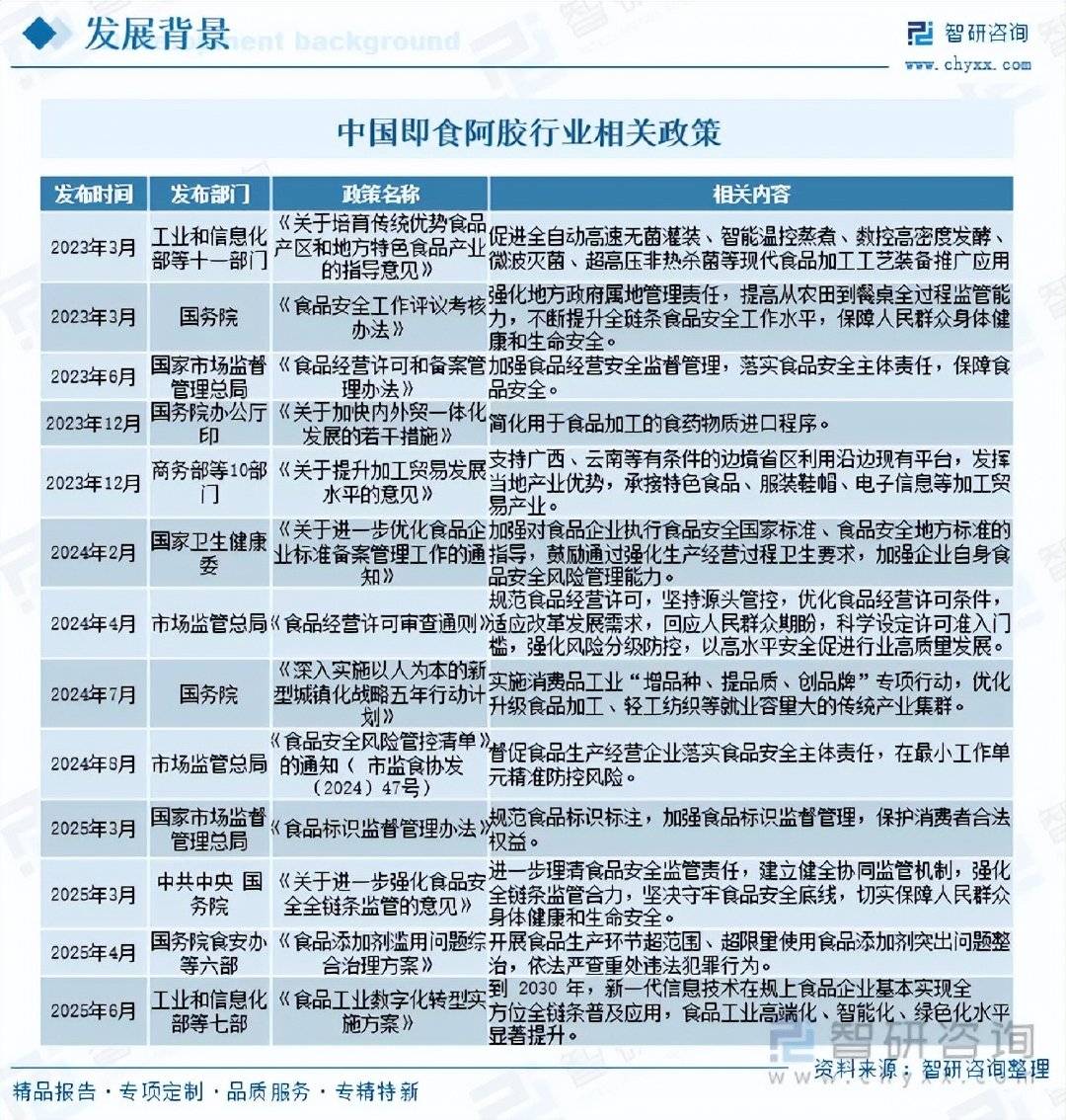 注:本文节选出自智研征询发布的《2025年中国即食阿胶行业市场政策、财产链图谱、市场规模、合作款式及成长趋向研判:东阿阿胶取福牌阿胶稳居第一梯队[图]》行业阐发文章,如需获取行业文章全数内容,可进入智研征询官网搜刮查看。智研征询发布的《中国即食阿胶行业市场现状查询拜访及将来趋向研判演讲》根据国度统计局、机构、行业协会发布的权势巨子数据,连系深度调研数据、专家反馈数据、内部运营数据等全域数据的收集取阐发,提拔客户的贸易决策效率。本演讲对中国即食阿胶行业现状取市场做了深切的查询拜访研究,并按照行业的成长轨迹对将来的成长前景取趋向做了审慎的判断,为投资者寻找新的市场投资机遇,进入即食阿胶行业投资结构供给了至关主要的决策参考根据。