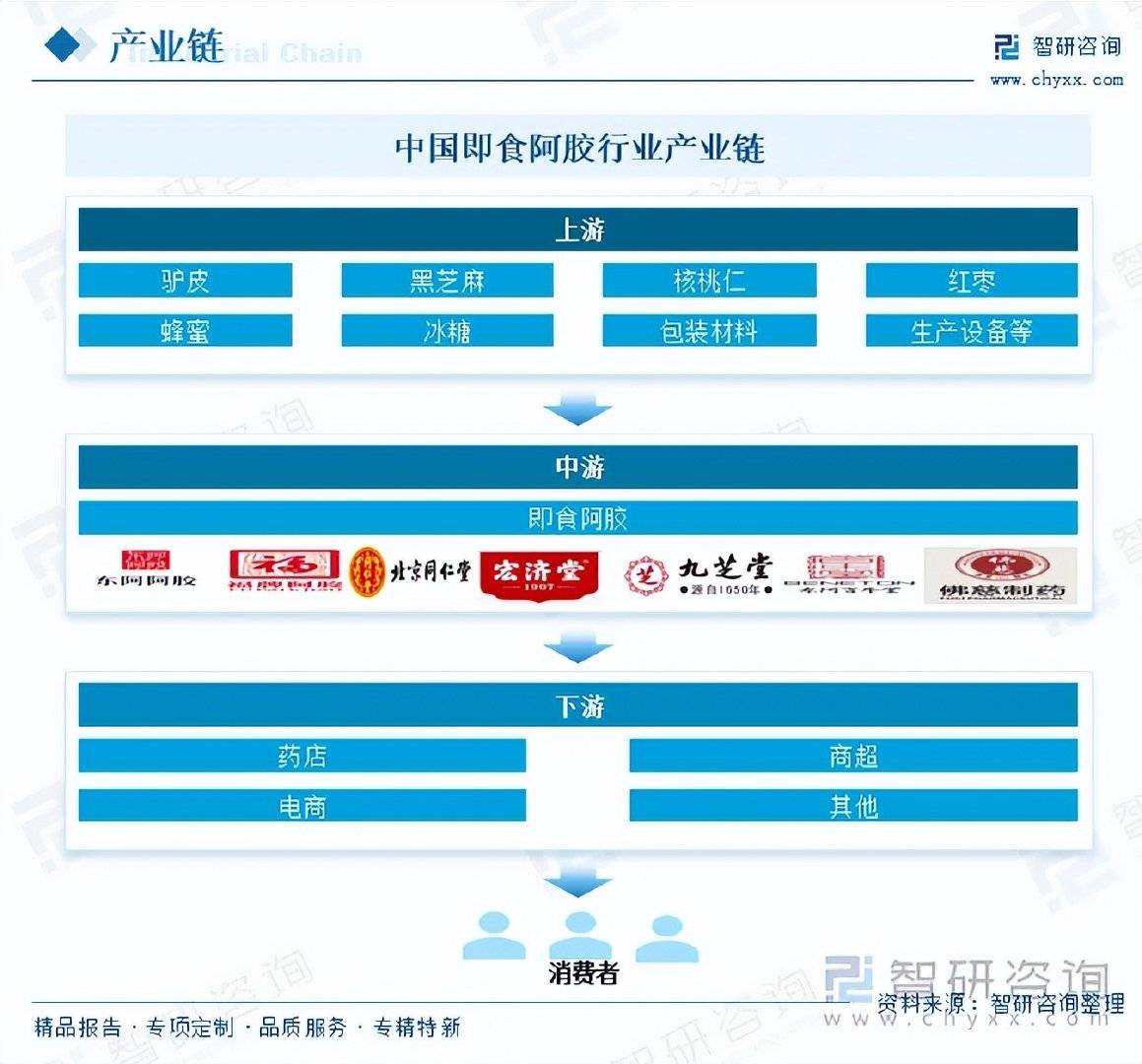 即食阿胶行业上逛次要包罗驴皮、黑芝麻、核桃仁、红枣、蜂蜜、冰糖等原材料供应商以及出产设备和包拆材料供应商;行业中逛为即食阿胶出产企业;行业下逛次要包罗药店、商超、电商等线上线下发卖渠道以及终端消费者,近年来,跟着国平易近健康认识的不竭提拔,即食阿胶消费群体已从保守中老年女性,拓展到沉视摄生的上班族、Z世代等,消费场景也从产后保养、冬季进补,延长到日常零食、节日礼物等,鞭策市场需求持续扩容。