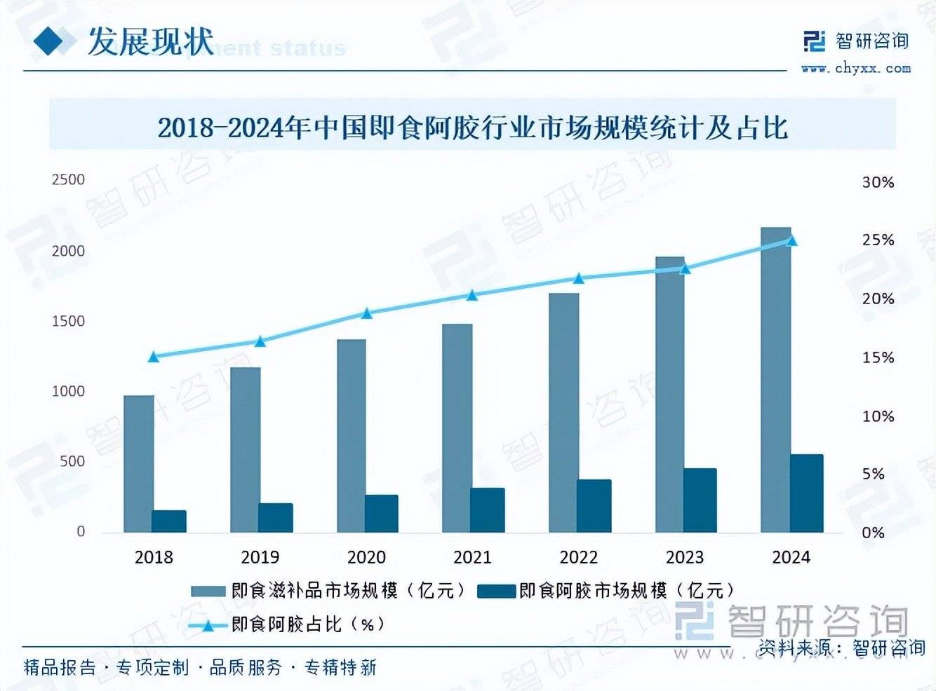 跟着“药食同源”普及,人们对健康的逃求不再局限于治病,而是转向日常保健,既有生齿老龄化带来的中老年群体对补血、加强免疫力等需求,也有女性群体对阿胶养颜功能的逃捧,还有Z世代对保守滋补品的接管度提拔,催生出对即食阿胶糕、阿胶软糖等年轻化产物的需求,取此同时,快节拍的现代糊口让消费者更青睐便利化产物,保守阿胶块的熬制流程繁琐,而即食阿胶适配通勤、课间、差旅等多场景,契合当下消费者的糊口节拍,此外,国潮文化兴起,即食阿胶做为承载保守文化的滋补品,常被用于礼物捐赠,进一步拓展了消费场景,鞭策礼盒拆即食阿胶的市场需求增加,据统计,2024年我国即食阿胶行业市场规模达543亿元,同比增加22。3%,占即食滋补操行业全体规模的25%。