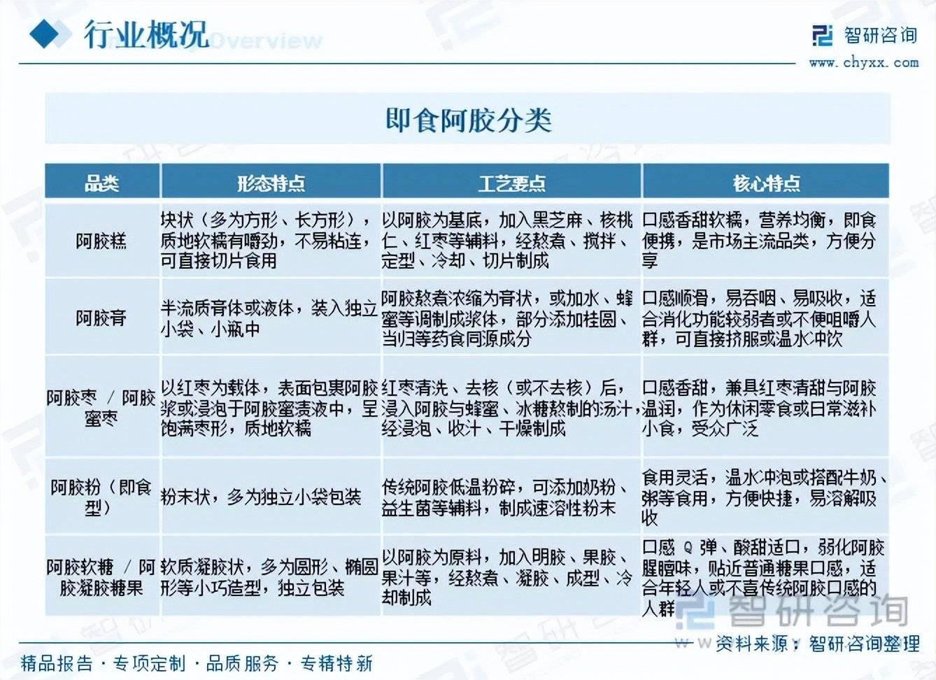 跟着“药食同源”普及,人们对健康的逃求不再局限于治病,而是转向日常保健,既有生齿老龄化带来的中老年群体对补血、加强免疫力等需求,也有女性群体对阿胶养颜功能的逃捧,还有Z世代对保守滋补品的接管度提拔,催生出对即食阿胶糕、阿胶软糖等年轻化产物的需求,取此同时,快节拍的现代糊口让消费者更青睐便利化产物,保守阿胶块的熬制流程繁琐,而即食阿胶适配通勤、课间、差旅等多场景,契合当下消费者的糊口节拍,此外,国潮文化兴起,即食阿胶做为承载保守文化的滋补品,常被用于礼物捐赠,进一步拓展了消费场景,鞭策礼盒拆即食阿胶的市场需求增加,据统计,2024年我国即食阿胶行业市场规模达543亿元,同比增加22。3%,占即食滋补操行业全体规模的25%。相关上市企业:东阿阿胶(000423)、同仁堂(600085)、九芝堂(000989)、百年堂(871975。NQ)、佛慈制药(002644)相关企业:山东福牌阿胶股份无限公司、山东宏济堂制药集团股份无限公司、山东东阿胶城阿胶生物手艺无限公司、山东固本堂健康财产开辟集团股份无限公司、聊城市福临堂阿胶成品无限公司、雷允上药业集团无限公司环节词:即食阿胶市场政策、即食阿胶财产链图谱、即食阿胶市场规模、即食阿胶合作款式、即食阿胶成长趋向即食阿胶是正在保守阿胶(以驴皮为次要原料,经浸泡、去毛、熬制、浓缩等工艺制成的固体胶块)根本上,通过配方优化、工艺改良,添加药食同源食材或食物辅料,经熟化、成型、切割、包拆等工序加工而成的可间接食用、无需额外熬煮的阿胶成品。