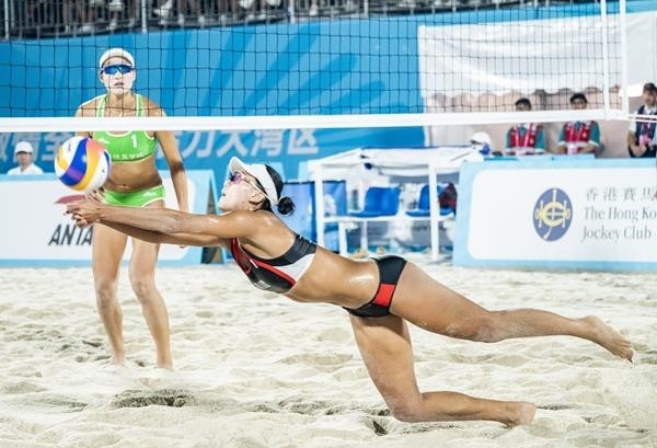 11月8日,第十五届全国活动会沙岸排球女子组决赛正在维多利亚公园沙岸排球场举行,福建队组合薛晨/曾津津以2∶1打败南京体育学院队组合严旭/周明利,夺得冠军。图为福建队的薛晨(黑衣)正在角逐中救球。视觉中国供图。